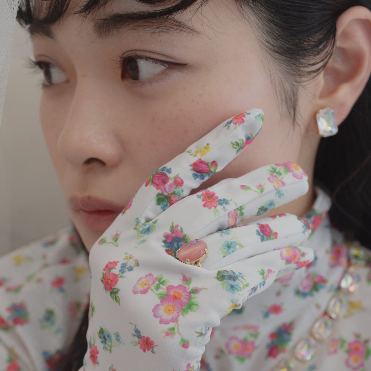 ◎ガラスを留めている金具は、背面が空いているタイプですがオーロラ加工のため肌色が透けるようなことはありませんが、光を通すので優しく瞬きます。
